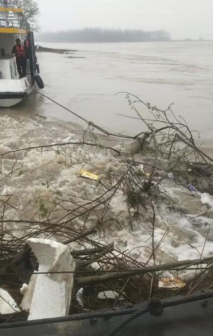 連日來,漢江流域普降大雨,河水猛漲,河道水位迅速上升,漢江上游大量樹枝、枯草夾雜著白色垃圾隨著河水一起流向荊襄供水有限公司關山取水浮船區(qū)域。