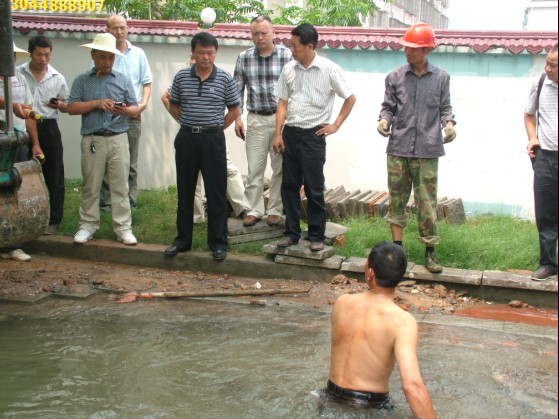 7月16日上午10:30左右,白云大道老水泥廠門口DN1200米供水主管突然爆裂,導(dǎo)致城區(qū)水壓降低,白云大道鐵路大橋以北、塔影路口以南地段、天鵝路等處部分用戶停水,市供水總公司組織送水車為停水地段用戶送水,經(jīng)全力搶修,于下午3時(shí)30分恢復(fù)供水。圖為搶修現(xiàn)場(chǎng)。