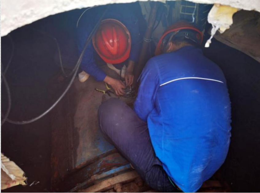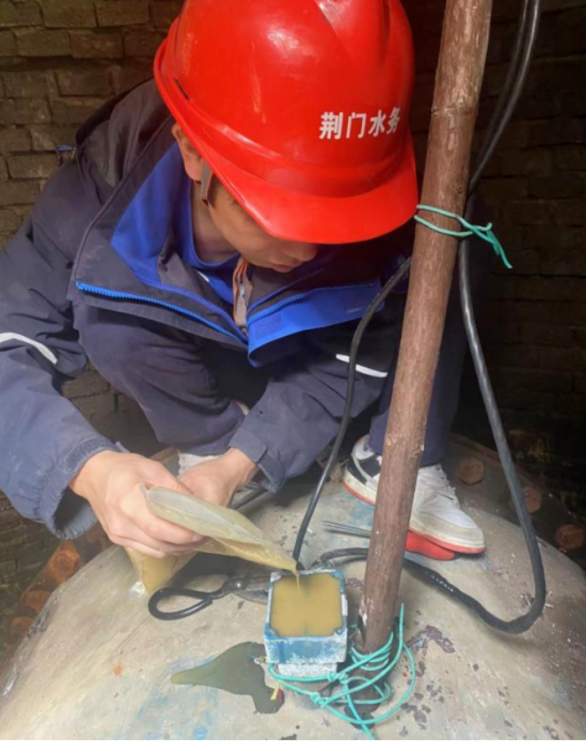 廠領(lǐng)導(dǎo)在綜合評估后,同意其思路,并作安全操作提醒。雖早有心理準(zhǔn)備,但在打開接線盒后的瞬間,李為龍等人還是倒吸一口涼氣。他們發(fā)現(xiàn)整個(gè)接線盒內(nèi)部被深色不透明的膠體充滿,無法掌握線路走向。短暫思索后,他們發(fā)揮水務(wù)人不怕苦、能戰(zhàn)斗的精神,嘗試按廠家給出建議,用熱風(fēng)槍加熱密封膠,但事與愿違,效果并不理想,密封膠沒有自動(dòng)融化流出。李為龍“改巧為笨”,在加熱的同時(shí)用小刀清理變軟的膠體。該處操作空間狹小,且不能損壞內(nèi)部的線路和接線端子,必須凝神聚力,是個(gè)“精細(xì)活”“體力活”。即便同事們輪番上陣,依然個(gè)個(gè)汗如雨下。功夫不負(fù)有心人,眾人合力熬過“漫長的”4小時(shí),最終完成了既定任務(wù)。
