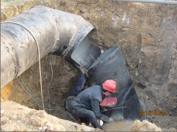 圖為施工人員正在用管道連接新、舊清水池。
