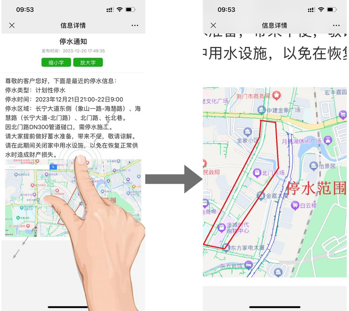 最新停水通知發(fā)出后,用戶通過【查看詳情】,點(diǎn)擊綠色【放大字】按鈕,可清晰查看停水類型、停水時間和停水區(qū)域。
