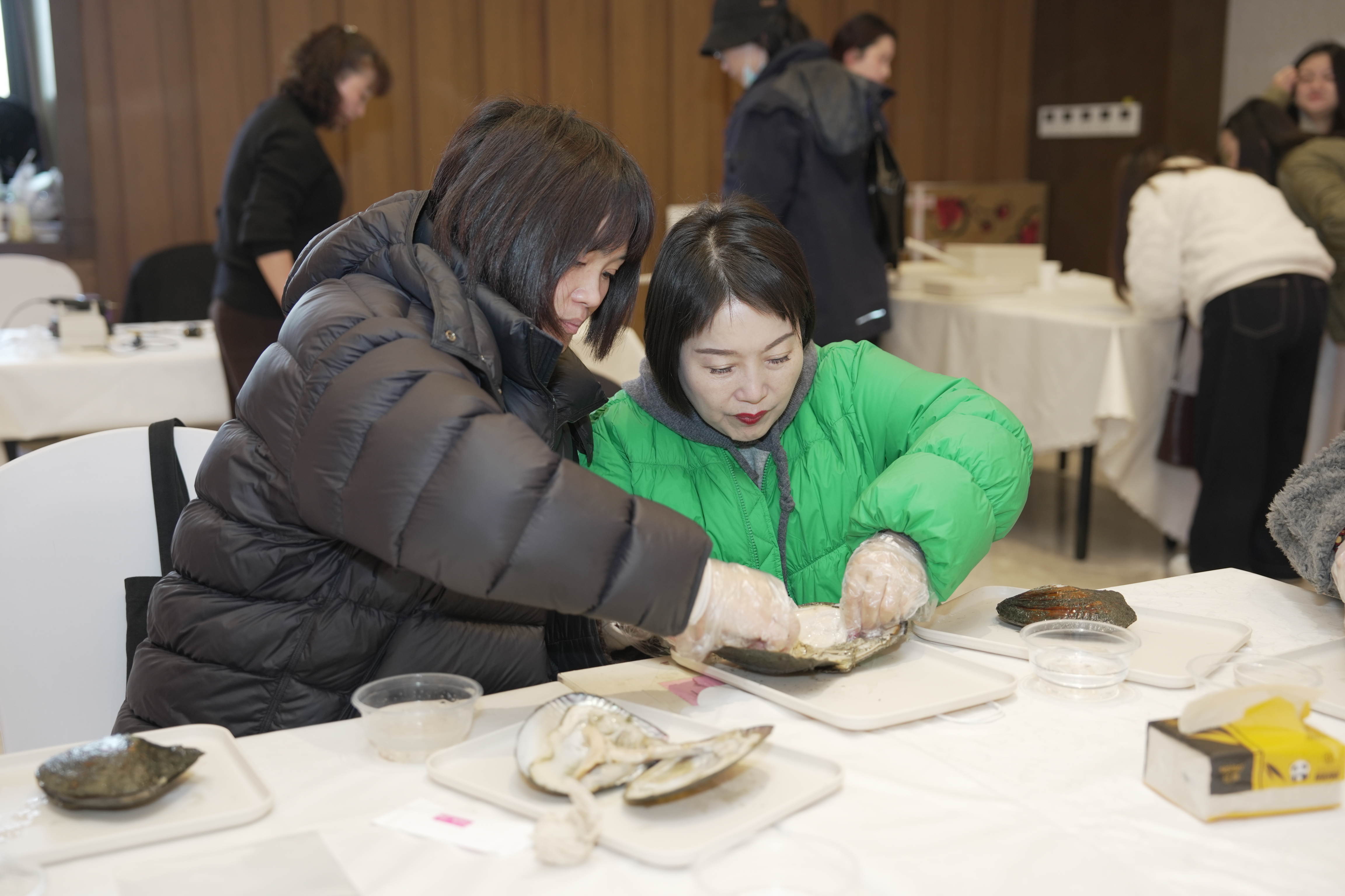 活動開始,老師詳細講解了珍珠的形成原理、種類以及開蚌的技巧和注意事項。開蚌環(huán)節(jié),大家充滿驚喜與期待,戴上手套,拿起工具,探尋珍寶,大家直呼“開盲盒”的感覺真不錯!