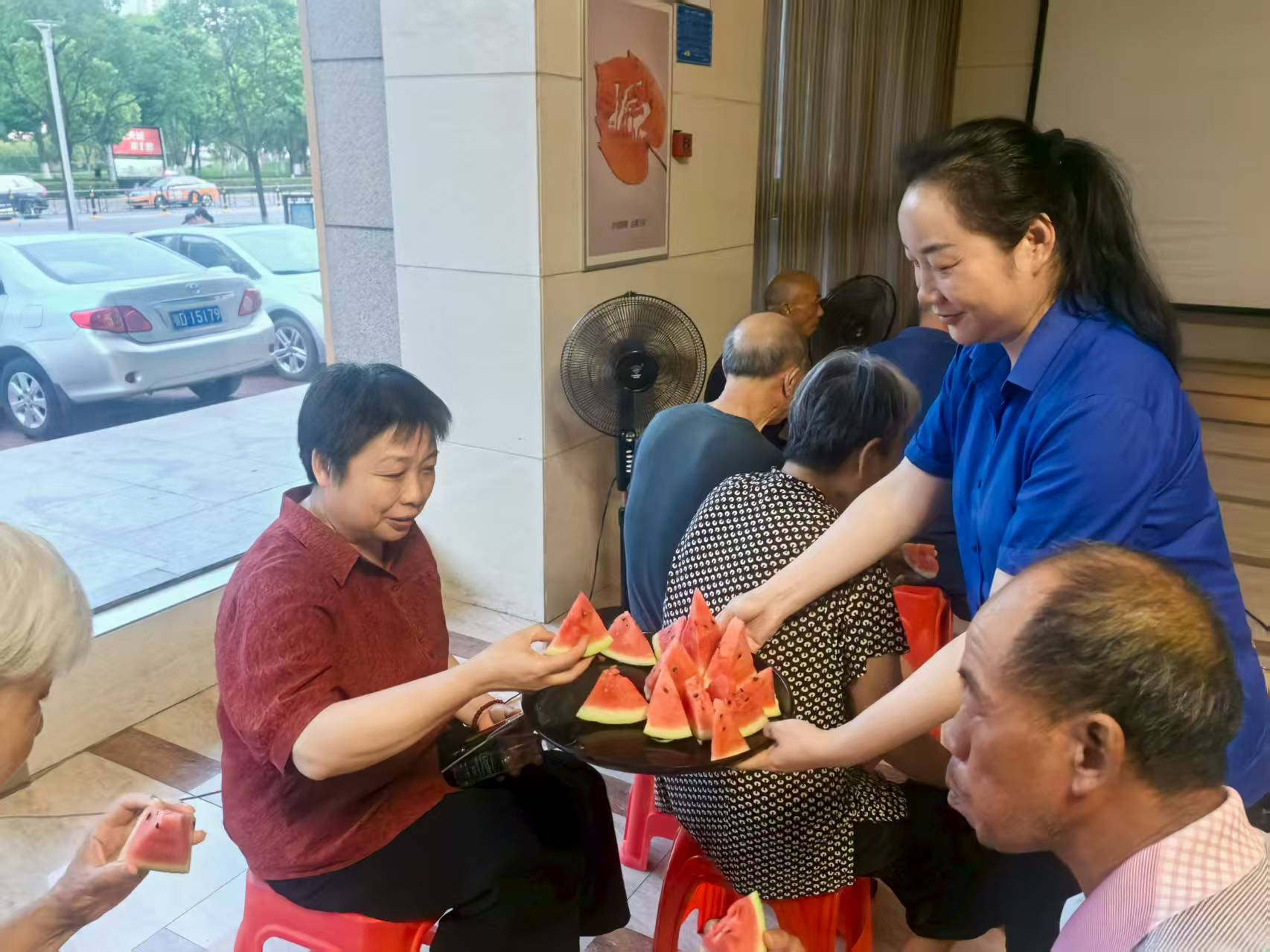 活動尚未開始,入口處已是一派熱鬧景象。物業(yè)工作人員早早備好冰鎮(zhèn)綠豆湯、清甜西瓜與礦泉水,為陸續(xù)到場的居民遞上夏日清涼。趁居民就座間隙,工作人員結合案例,生動講解消防隱患排查、電信詐騙防范等實用知識,“手把手”教大家識別騙局、掌握逃生技巧,在輕松互動中筑牢社區(qū)安全防線。
