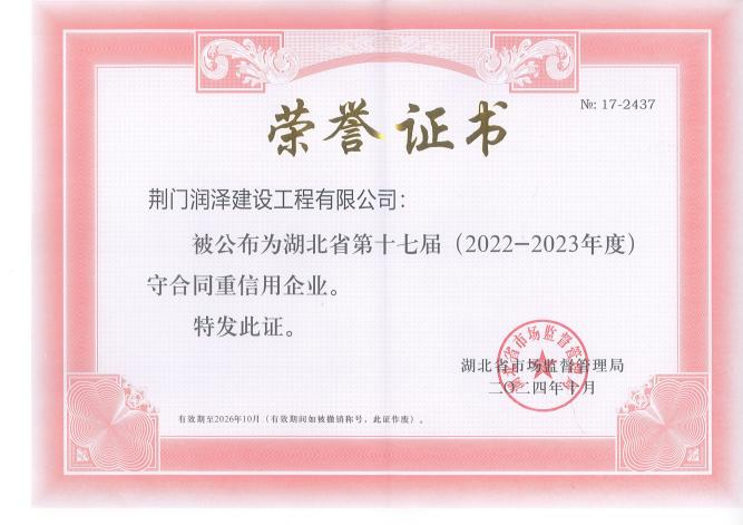 憑著“誠信為本、質(zhì)量為根”的堅守,潤澤公司連續(xù)兩年獲評荊門市和湖北?。?022-2023年度)“守合同重信用企業(yè)”,市場競爭力和品牌影響力持續(xù)攀升。