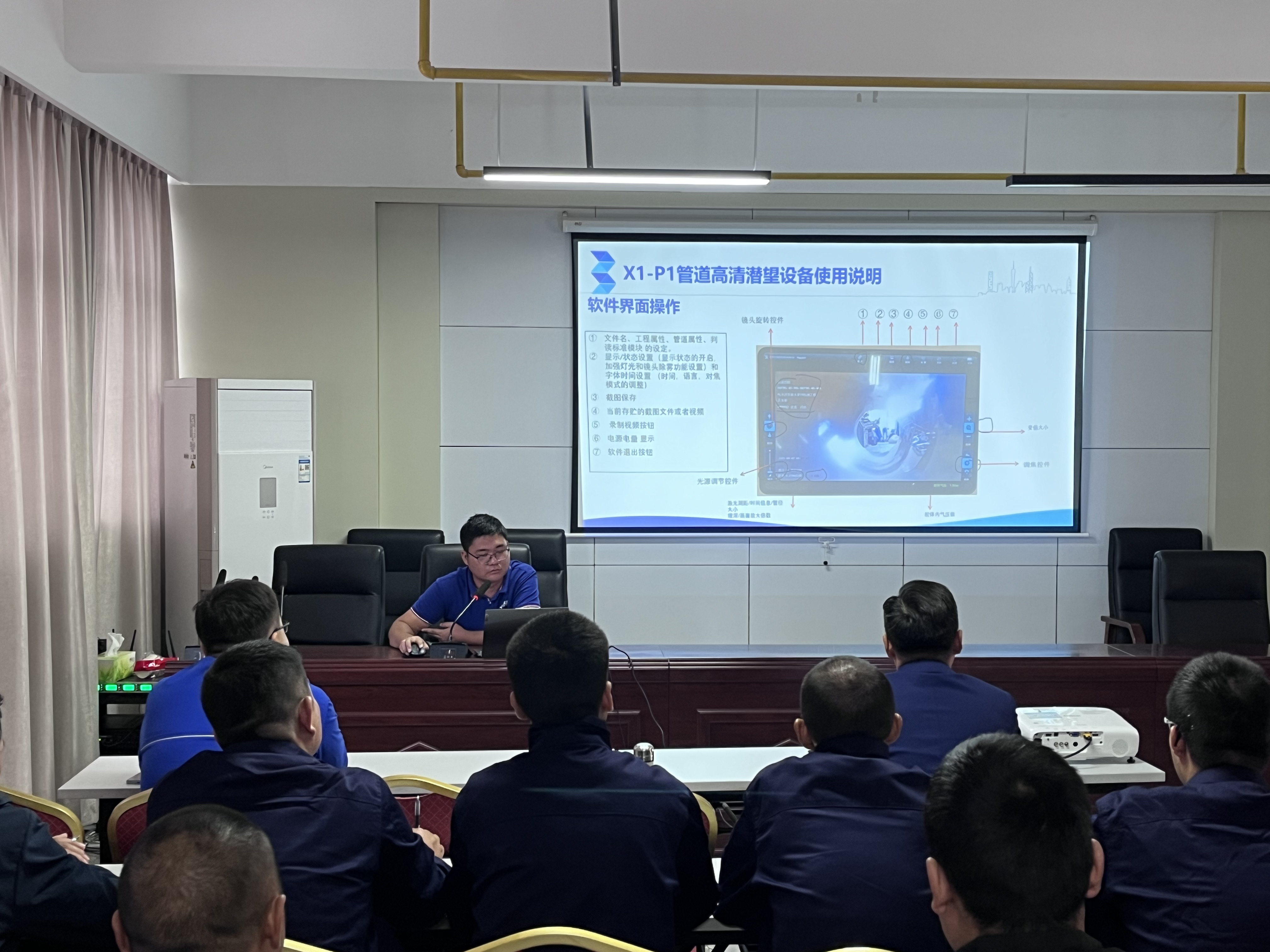 本次培訓采用“理論+實操”相結(jié)合模式。理論授課環(huán)節(jié),授課老師圍繞CCTV管道檢測機器人工作原理、設備結(jié)構(gòu)組成、操作規(guī)范及安全注意事項等內(nèi)容,通過PPT展示和應用案例開展系統(tǒng)授課。參訓員工全神貫注,詳細記錄操作要點,積極與老師互動交流,對這位“新伙伴”有了初步的理論認知。