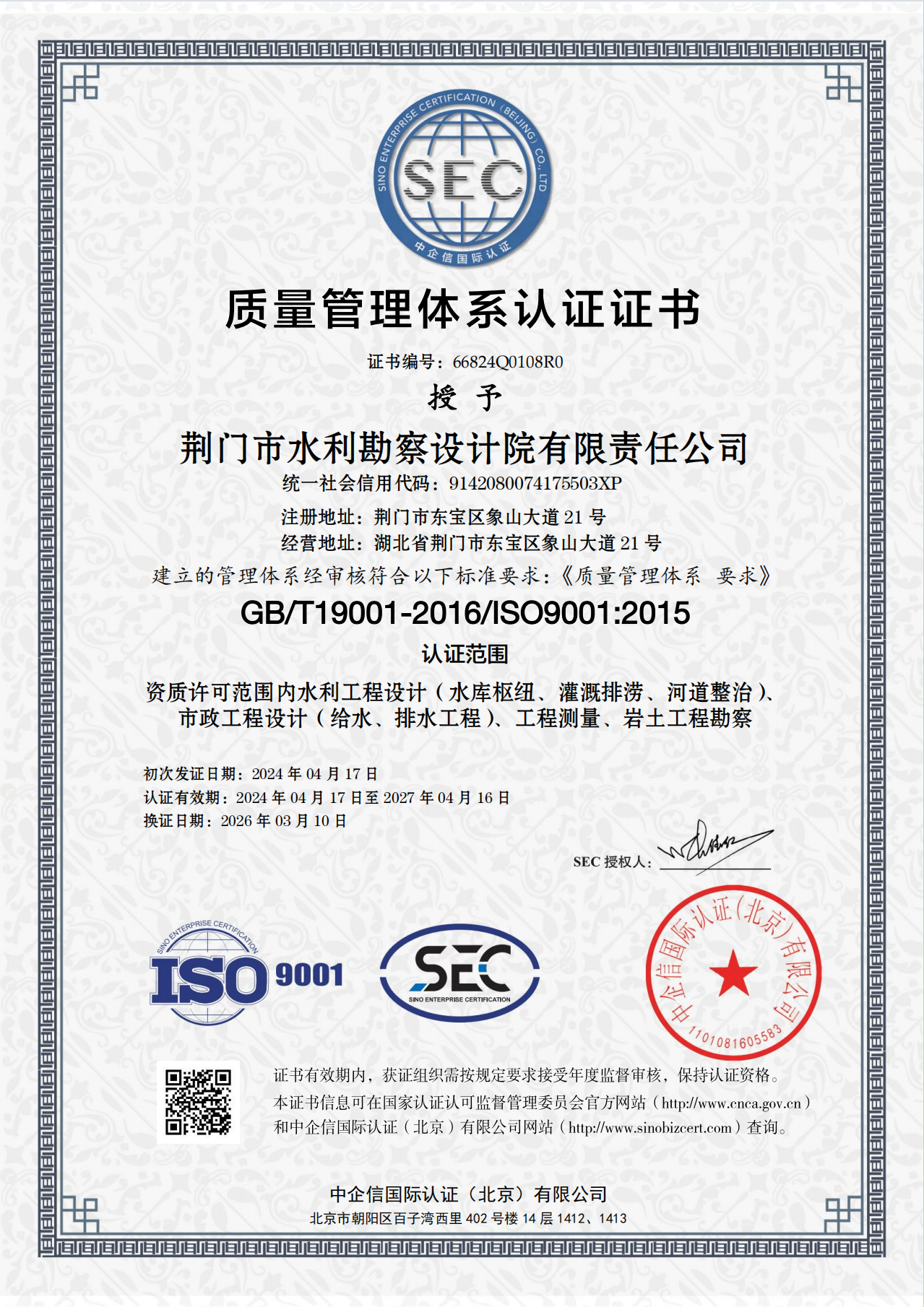 近日,市水務(wù)集團(tuán)下屬子公司荊門(mén)市水利勘察設(shè)計(jì)院有限責(zé)任公司(以下簡(jiǎn)稱(chēng)“水勘院”)順利通過(guò)QES(質(zhì)量、環(huán)境及職業(yè)健康安全)三體系再認(rèn)證審核,并新增市政工程設(shè)計(jì)(給水、排水工程)認(rèn)證范圍,這標(biāo)志著水勘院從水利工程向市政水務(wù)工程領(lǐng)域邁出了實(shí)質(zhì)性的一步。