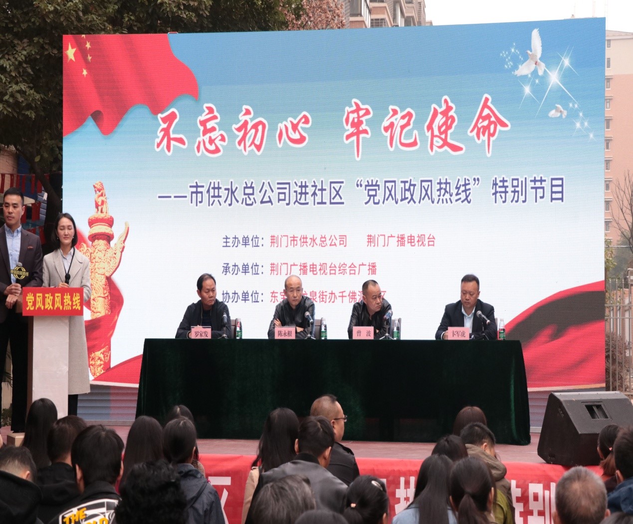 11月 6日上午,由荊門市供水總公司和荊門廣播電視臺聯(lián)合舉辦的“荊門供水進社區(qū)‘黨風政風熱線’特別節(jié)目”在荊門千佛洞社區(qū)舉行。市供水總公司黨委書記、總經(jīng)理陳永根帶領(lǐng)領(lǐng)導班子相關(guān)成員參加節(jié)目現(xiàn)場(網(wǎng)絡(luò))直播,圍繞“不忘初心、牢記使命”主題教育,傾聽民情民意,接受現(xiàn)場問政,回應(yīng)百姓訴求,解決用戶難題。