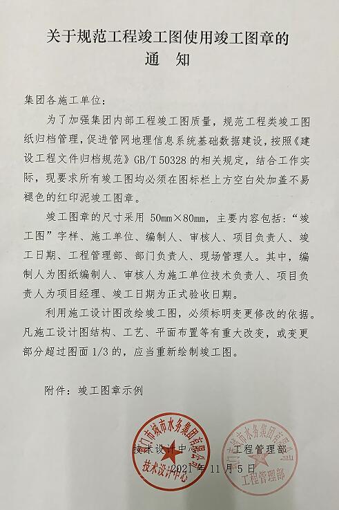 近日,技術(shù)設(shè)計(jì)中心為了加強(qiáng)集團(tuán)內(nèi)部工程竣工圖質(zhì)量,規(guī)范工程類(lèi)竣工圖紙歸檔管理,促進(jìn)管網(wǎng)地理信息系統(tǒng)基礎(chǔ)數(shù)據(jù)建設(shè),聯(lián)合工程管理部編發(fā)了規(guī)范工程竣工圖使用竣工圖章的要求和指導(dǎo)意見(jiàn)。