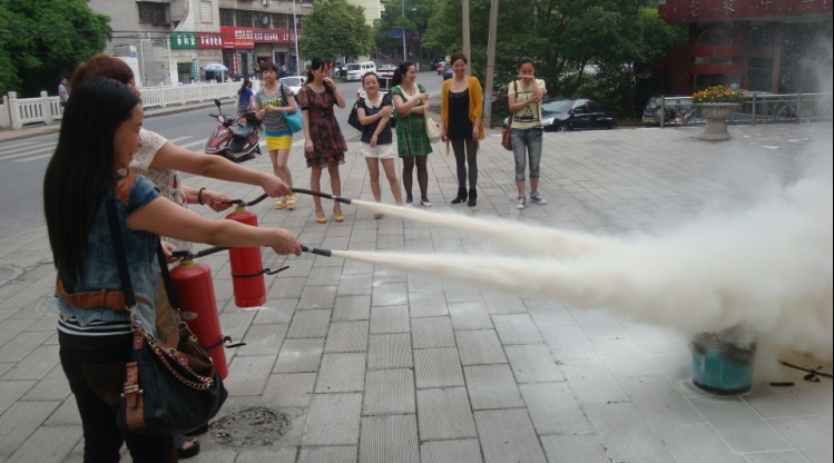 “實踐是檢驗真理的唯一標準”。城區(qū)營業(yè)所最后組織全員進行了滅火實戰(zhàn)演練。一個鐵制水桶里裝滿了干柴作為“火源”,兩個滅火器嚴陣以待。在干柴被點燃后燃起熊熊大火的時候,最先演練的兩位職工拿起滅火器拔出保險栓,把橡皮管對準火源,按下閥門。兩股白色的干粉噴涌而出,大火瞬息被撲滅。接下來每一位職工依次進行了滅火操作。